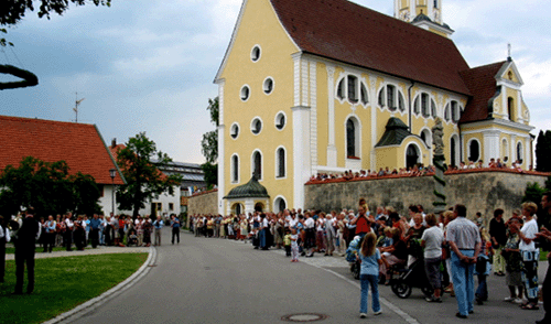 Pünktlich um 19 Uhr marschierten die Kapellen Geltendorf, Geretshausen, Walleshausen und Windach Richtung Dorfplatz los. Dort hatten sich schon viele Zuschauer versammelt. |